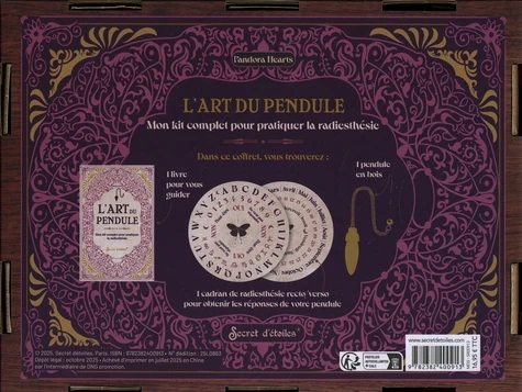 Initiez-vous à la radiesthésie avec le coffret L'art du pendule de Pandora Hearts, comprenant un livre guide, un pendule en bois et un cadran recto/verso.