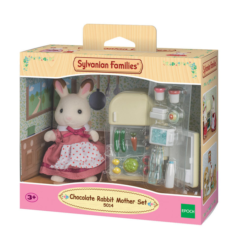Enrichissez votre maison Sylvanian avec le set 'La maman Lapin Chocolat et le réfrigérateur', comprenant une figurine et plus de 14 accessoires pour des heures de jeu créatif.