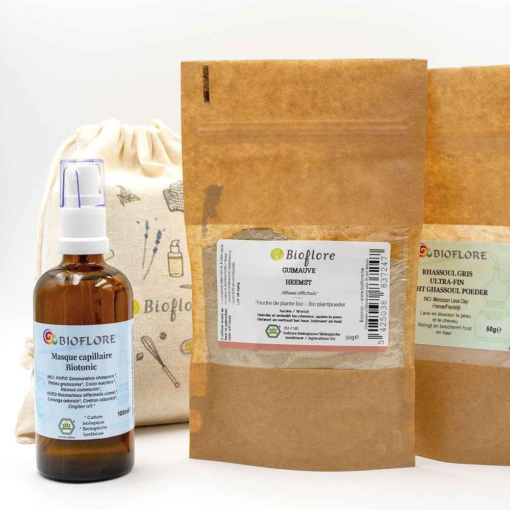 Le coffret 'Les Essentiels Cheveux' de Bioflore propose une routine capillaire naturelle avec un masque Biotonic, du rhassoul et de la poudre de guimauve pour des cheveux revitalisés et sublimés.