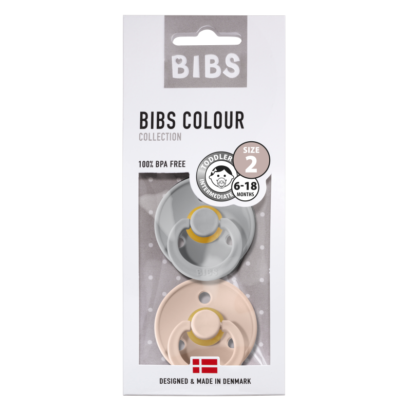 Lot de 2 tétines BIBS T2 en caoutchouc naturel, coloris cloud et blush, pour bébés de 6 à 18 mois. Design ergonomique et sans substances nocives.