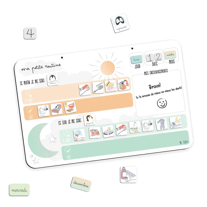 Les magnets permettent de créer une routine du matin et du soirqui ressemble à votre famille. Votre enfant dispose de deux rangées sur le support magnétique : il peut ainsi facilement identifier ce qu’il a déjà fait et ce qu’il lui reste à faire. La bulle « mes encouragements » vous permet de le soutenir dans ses progrès et le motiver en valorisant ses réussites.