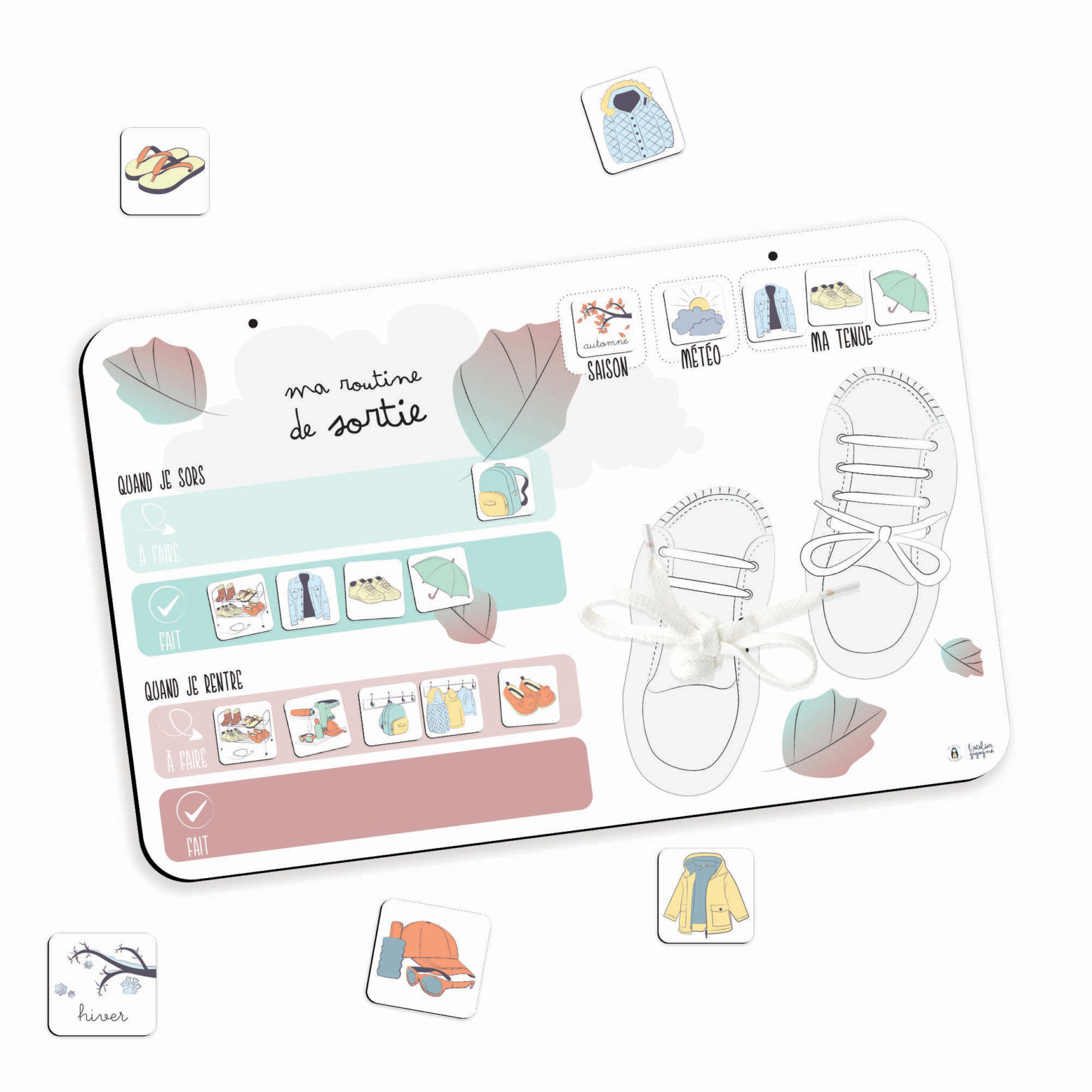« Ma routine de sortie » est un plateau ludique et éducatif pour apprendre à votre enfant à se préparer pour sortir ou rentrer de la maison.