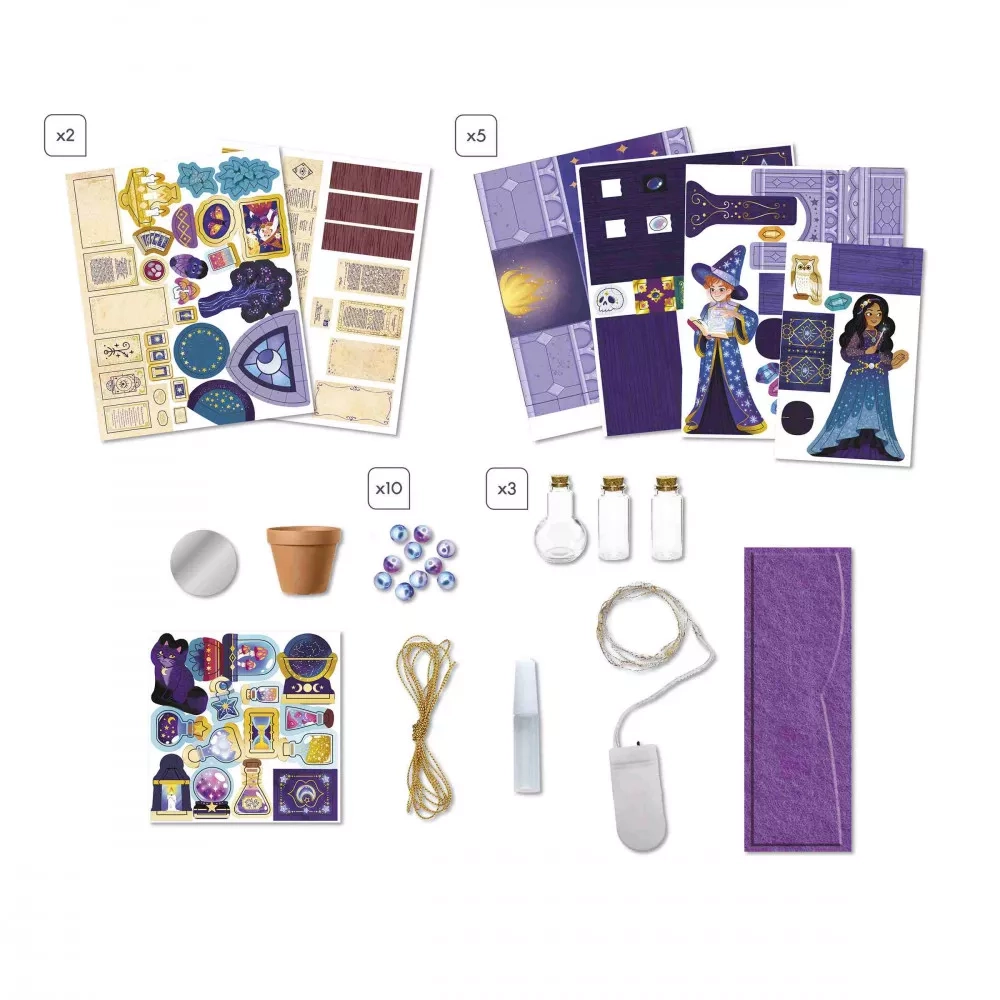 Le coffret créatif miniature contient : 5 planches de carton prédécoupées, 2 feuilles de papier prédécoupé, 1 planche de feutrine prédécoupée, 1 tube de colle, 1 guirlande lumineuse (piles incluses), 3 fioles en verre, 1 miroir autocollant, des perles nacrées, de la ficelle dorée, 1 pot en terre-cuite et 1 livret avec les instructions et les modèles. Les fans de sorcellerie seront ravis de pouvoir jouer avec les personnages une fois la salle des potions assemblée !