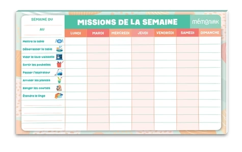 Organisez les tâches familiales avec le bloc aimanté 'Missions de la semaine Mémoniak' : 52 listes hebdomadaires détachables, missions pré-remplies et espaces personnalisables pour une répartition efficace des corvées.
