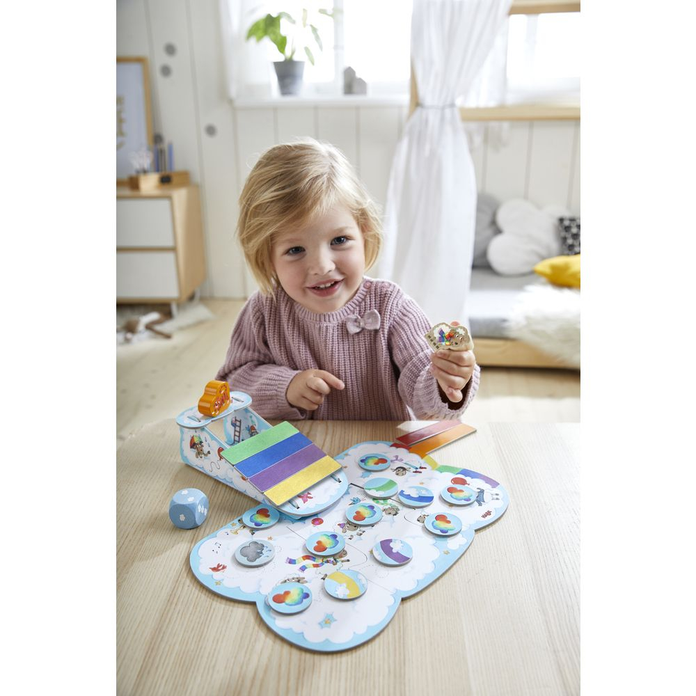 • Assemblez le plateau de jeu, puis insérez dans les fentes le toboggan formé. Posez les 6 bandes de l’arc-en-ciel à côté des bandes correspondantes sur le plateau de jeu. Répartissez les plaquettes nuages faces cachées au hasard sur le plateau. Mimi le mouton est posé sur un nuage au hasard et Kaya le chat en haut du toboggan arc-en-ciel. • Jeu 1, classement coopératif : lancez le dé à tour de rôle dans le sens des aiguilles d’une montre. Que montre le dé ? Un, deux ou trois nuages : sautez avec Mimi du même nombre de plaquettes nuages et arrêtez-vous sur un nuage arc-en-ciel. Retournez-le. Que voit-on dessus ? Une couleur : nommez la couleur et prenez la bande assortie, puis posez-la sur le toboggan arc-en-ciel. Un nuage de pluie : vous ne pouvez pas composer d’arc-en-ciel cette fois-ci. • Le jeu se termine lorsque les six bandes de l’arc-en-ciel sont posées sur le toboggan arc-en-ciel. Les enfants laissent glisser le petit chat sur le toboggan. • Le jeu 2 est un mémo coopératif : sur le même principe que le jeu 1 mais sans le dé, les enfants doivent retrouver les nuages de la bonne couleur pour former l’arc-en-ciel dans le bon ordre.