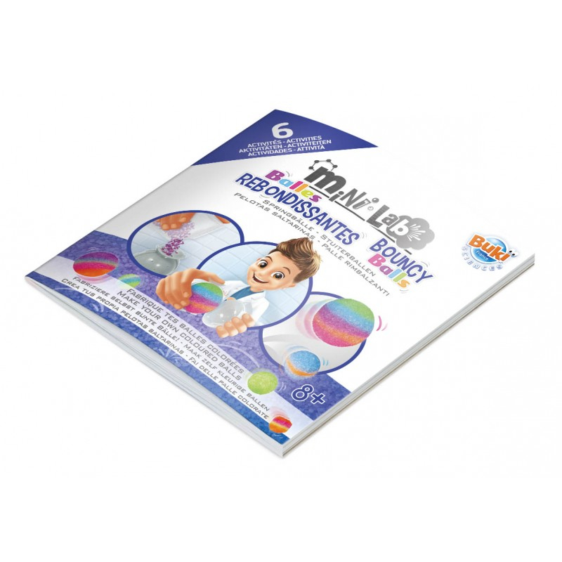 Créez des balles rebondissantes multicolores, dont certaines phosphorescentes, avec le Mini Lab de Buki Sciences. Un coffret ludique pour les enfants dès 8 ans.