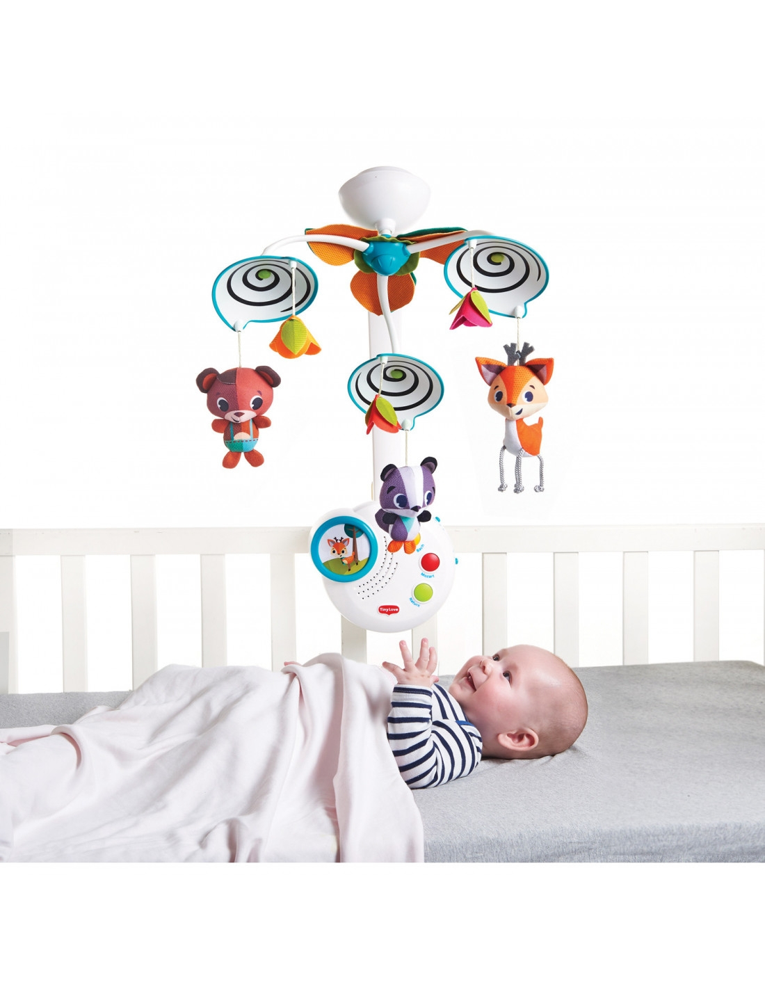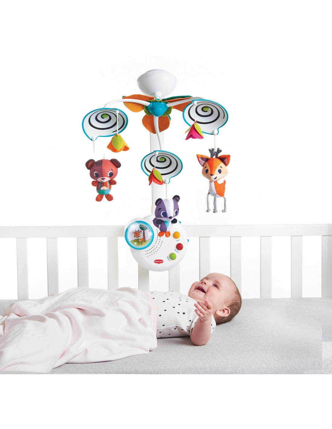 Les adorables personnages du thème Dans la Forêt apparaissent et disparaissent au-dessus de bébé. Ce mouvement crée un jeu de cache-cache qui aide bébé à saisir le concept de permanence des objets. Quand bébé grandit et commence à activer la boîte à musique tout seul, il commence à découvrir le merveilleux principe de cause (appuyer sur un bouton) à effet (déclenche la musique et les lumières).