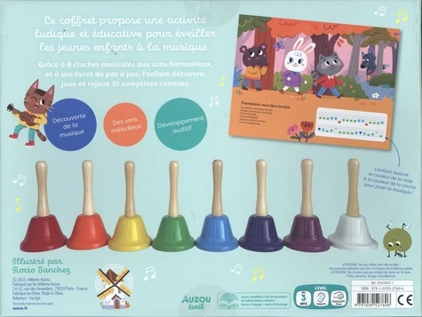 Initiez votre enfant à la musique avec 'Mon coffret d'éveil musical' d'Auzou : 8 cloches colorées et un livre de 10 comptines avec partitions colorées.