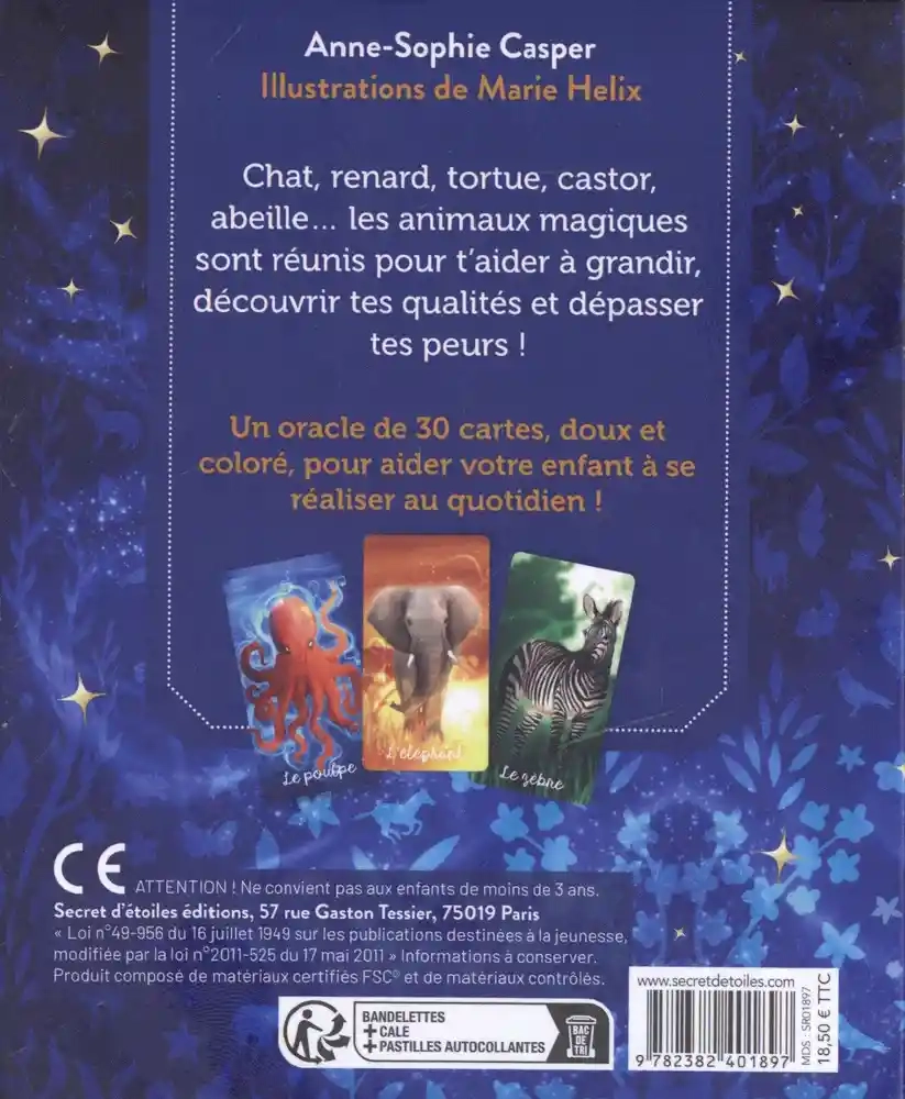 Chat, renard, tortue, castor, abeille... les animaux magiques sont réunis pour t'aider à grandir, découvrir tes qualités et dépasser tes peurs ! Un oracle de 30 cartes, doux et coloré, pour aider votre enfant à se réaliser au quotidien