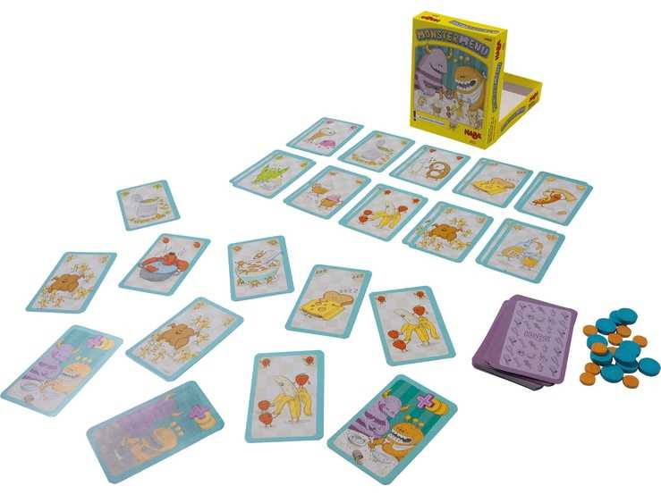 Contenu : 48 cartes aliment (4 de chaque monster-aliment), 12 cartes régal, 10 monster-jetons orange (1 point), 10 monster-jetons turquoise (3 points).