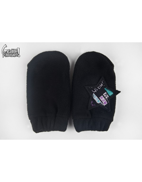 Moufles en polar noir décoré d'une étoile en polar surmonté d'une autre en coton imprimé.
