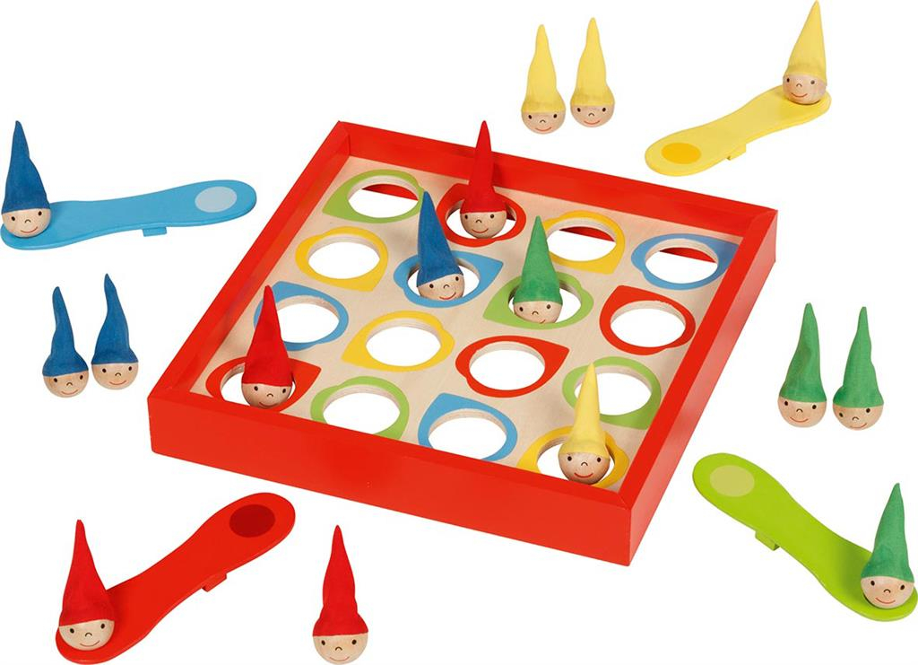 Le jeu 'Nains sauteurs' de Goki est un jeu d'adresse en bois où les enfants dès 4 ans doivent faire sauter des nains colorés dans les trous correspondants à l'aide de catapultes, développant ainsi leur dextérité et coordination.