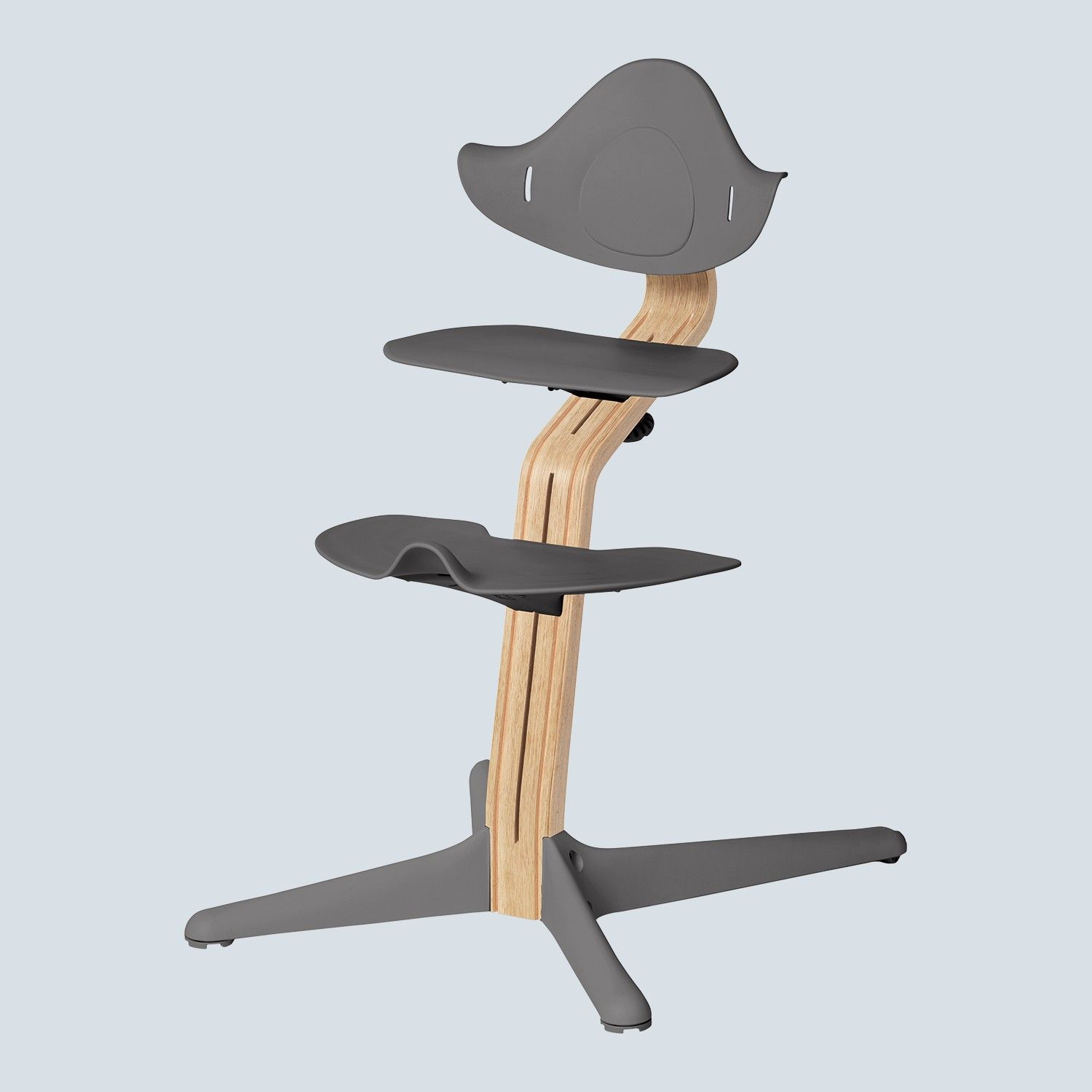 La chaise haute évolutive Nomi en gris comprend assise, repose-pieds, dossier et pieds (sans base en bois). Conçue pour accompagner votre enfant de la naissance à l'adolescence, elle offre un design ergonomique et des réglages sans outil pour un confort optimal.