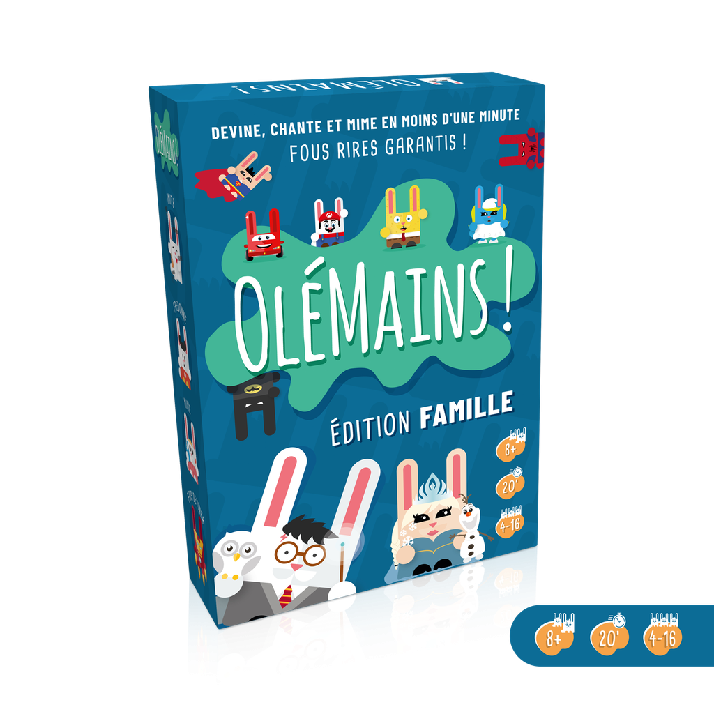 Olémains ! - Édition Famille est un jeu d'ambiance hilarant où les joueurs, en équipe, doivent deviner des mots en mimant, chantant ou décrivant, le tout en une minute chrono. Idéal pour des moments de rire en famille ou entre amis.