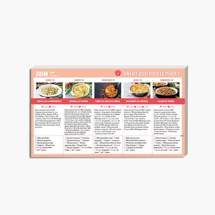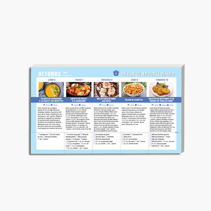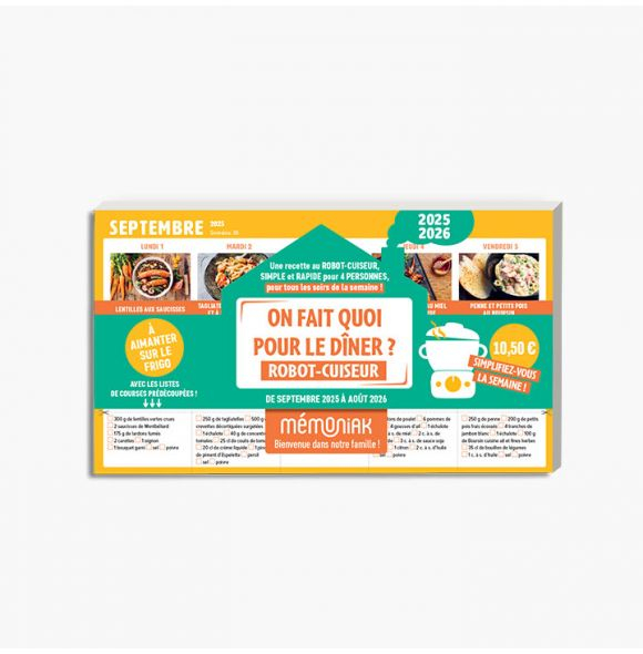 On fait quoi pour le dîner au robot-cuiseur à aimanter sur le frigo 2025-2026 est un calendrier pratique offrant des recettes hebdomadaires au robot-cuiseur, avec listes de courses détachables et un aimant puissant pour le fixer sur votre réfrigérateur.
