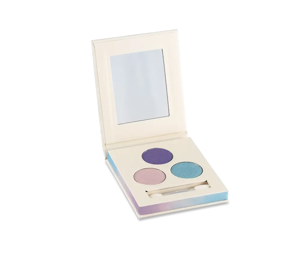 La Palette 3 fards à paupières Hiver de Namaki offre trois teintes irisées inspirées des paysages enneigés, avec un applicateur double-embout et un miroir intégré, le tout dans un packaging éco-conçu.