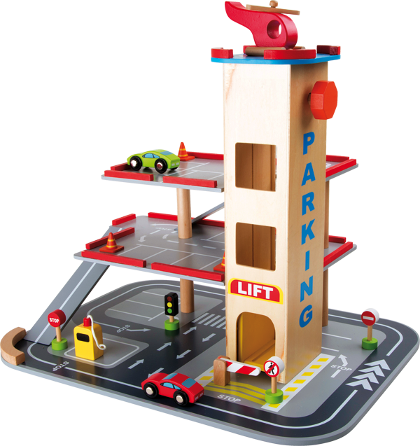 Beaucoup de plaisir sur trois étages. Il se passe beaucoup de choses dans ce parking en bois à plusieurs étages. Un ascenseur continu à manivelle transporte les voitures vers le haut pour qu´elles redescendent ensuite à toute allure. L´héliport offre de l´espace pour un hélicoptère prêt pour toute mission. Une pompe à essence est disponible pour l´entraînement nécessaire. Les feux de circulation et les panneaux de signalisation routière assurent l´ordre. 13 pièces. Qui arrive en premier au 3ème étage? Un ascenseur continu à manivelle transporte les voitures vers le haut pour que celles-ci puissent ensuite redescendre à toute allure. Les petits vont s´amuser avec ce parking qui comprend de nombreux accessoires et même un hélicoptère avec héliport !