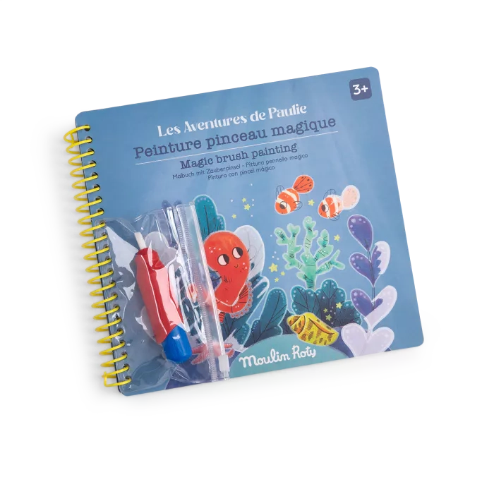 Découvrez la Peinture pinceau magique Les Aventures de Paulie de Moulin Roty, un cahier à spirale réutilisable où les enfants dès 3 ans peuvent peindre avec de l'eau pour révéler des illustrations colorées de Paulie le poulpe et ses amis.