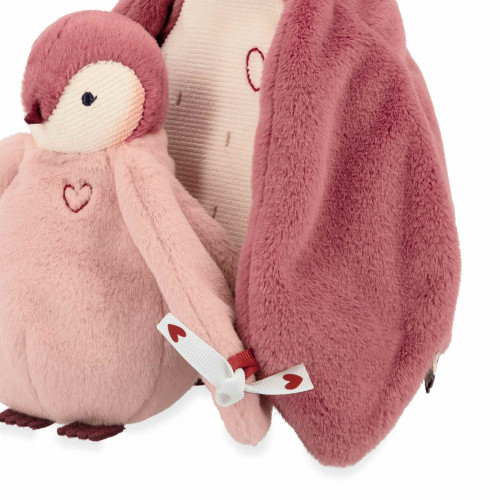 Petit et grand manchot sont (presque) inséparables ! Adaptées dès la naissance, ces peluches manchots ont été conçues pour réconforter et rassurer bébé dans les moments de séparation. Douces et moelleuses, ces peluches roses représentent un parent et son petit, ainsi que le lien si particulier qui les unit. Les ailes du plus grand manchot sont très agréables à câliner et enveloppent le bébé manchot pour le garder tout contre lui. Les rubans ornés d'un petit cœur et présents aux extrémités des ailes permettent de lier les peluches : ils symbolisent la protection et le lien d'attachement entre un parent et son enfant. Cadeau de naissance idéal, ce duo de peluches Kaloo permet de rassurer bébé lorsqu'il est angoissé en l'absence de ses parents. Jolis cœurs et gros câlins sont représentés, pour expliquer aux tout-petits que le lien spécial qui les unit à leur parent est fort et ne disparait pas lorsqu'ils ne sont pas présents avec eux. Pour inviter aux câlins et stimuler les sens de bébé, ces manchots en peluche sont composés de différentes matières (velours côtelé et fourrure synthétique) et proposent des broderies et étiquettes à parcourir du bout des doigts ! On adore plonger ses mains dans leur fourrure et câliner leur ventre rebondi. Le petit manchot mesure 15 cm et le plus grand mesure 25 cm, ils sont tous deux composés de rembourrage en polyester recyclé. Présenté dans leur beau coffret assorti, ce lot de peluches pour bébé sera du plus bel effet pour une naissance ou en toute occasion : la boîte cadeau est personnalisable grâce à l'encart prévu à cet effet, et peut être réutilisée pour conserver les premiers souvenirs de bébé. Ces peluches manchots câlins roses font partie de notre gamme Complices : une collection de peluches et doudous exprimant amour et réconfort, pour illustrer le lien qui unit un bébé à ses parents et ainsi l'accompagner en douceur dans les premières séparations.