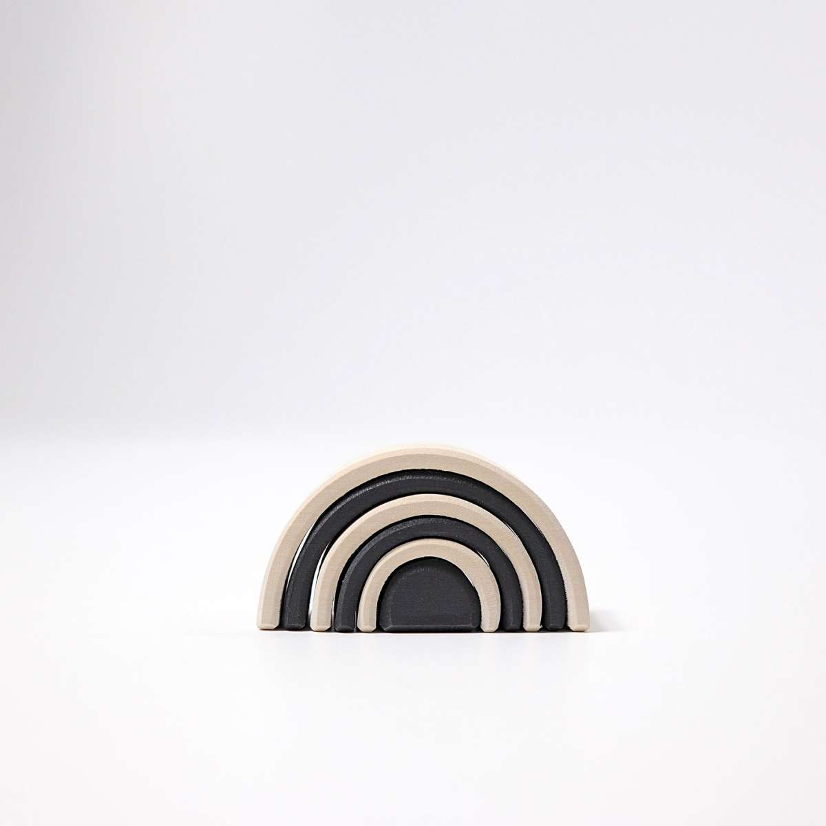 Le Petit Arc-en-ciel Monochrome de Grimm's est un jouet en bois de 6 pièces en noir et blanc, idéal pour stimuler la créativité des enfants dès 3 ans.