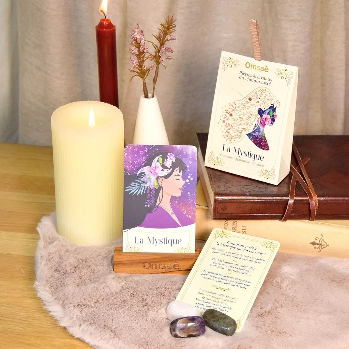 Découvrez 2 cartes pour vous aider à révéler votre énergie divine accompagnées de 3 pierres naturelle complémentaires au caractère de la Mustique : l'améthyste, le cristal de roche et la labradorite.