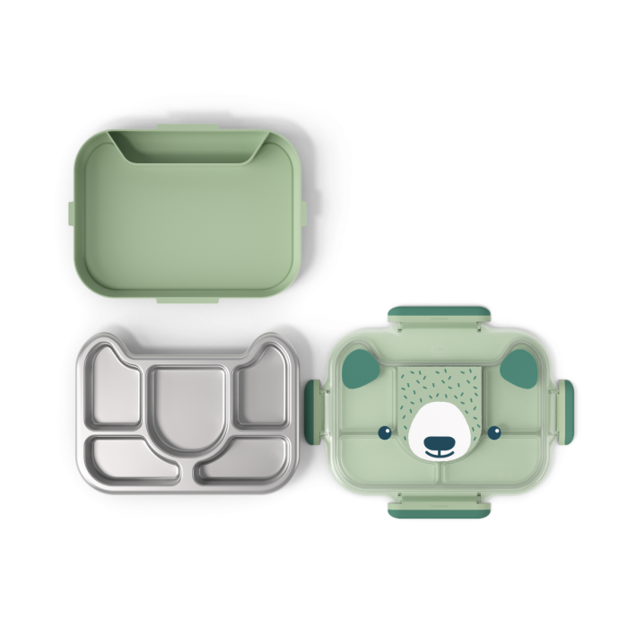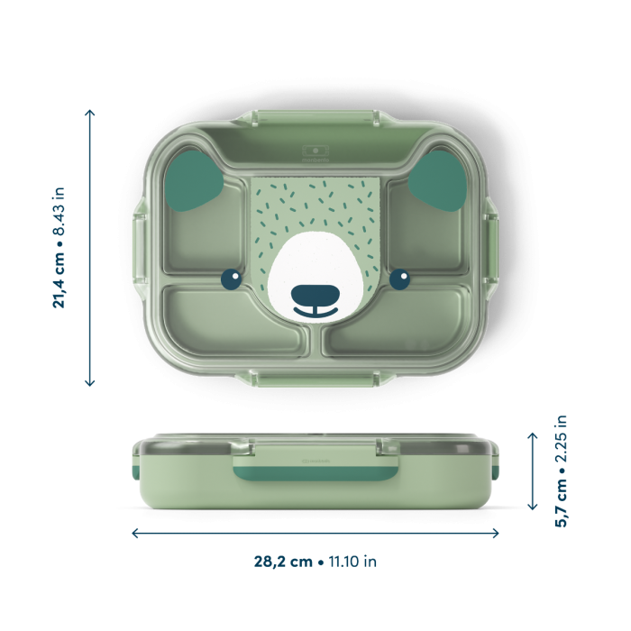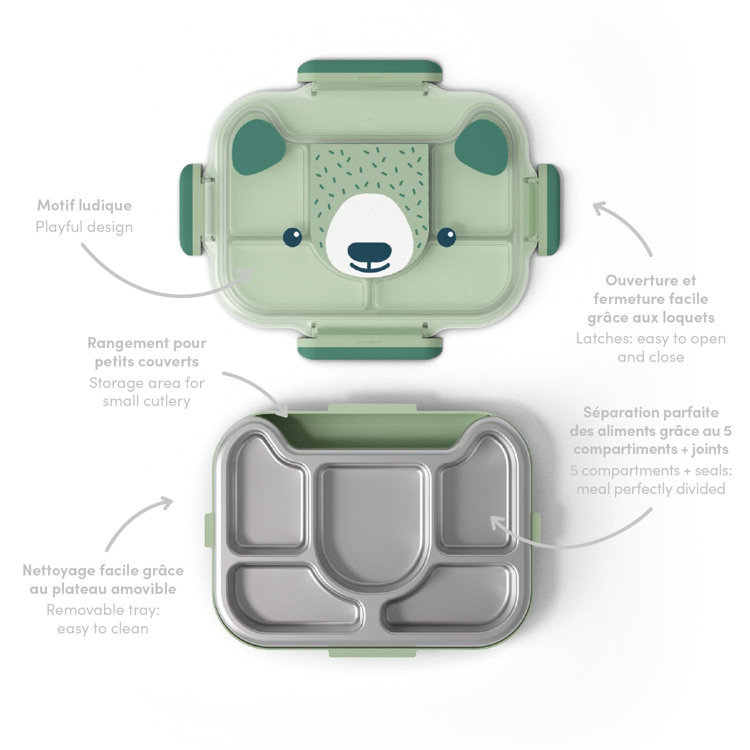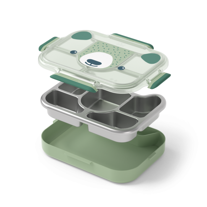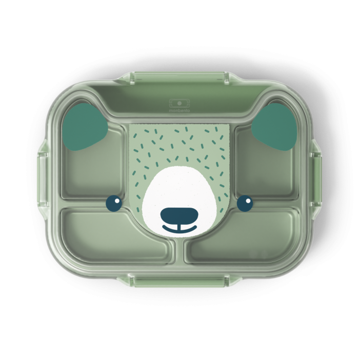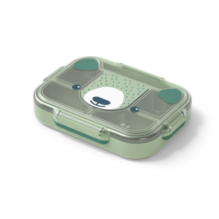 Le MB Wonder vert Bear de Monbento est un plateau repas compartimenté pour enfants, doté de 5 sections en acier inoxydable, d'un design ludique avec un petit ours sur le couvercle transparent, et d'une capacité de 950 ml. Facile à utiliser et à nettoyer, il est parfait pour des repas équilibrés à l'école ou en sortie.