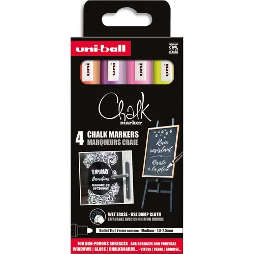 Pochette 4 marqueurs craie CHALK. Pointe conique 1,8-2,5mm. Fluo : Jaune, Orange, Rose et violet UNI-BALL