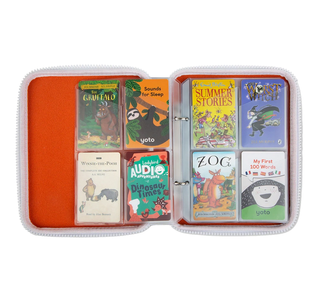 Porte-cartes souple pour Yoto, capacité de 64 cartes, poches inclinées, fermeture à glissière, livré avec 8 feuilles plastiques, dimensions : 24,5 x 17,5 x 3,5 cm, disponible en orange, rose et bleu.