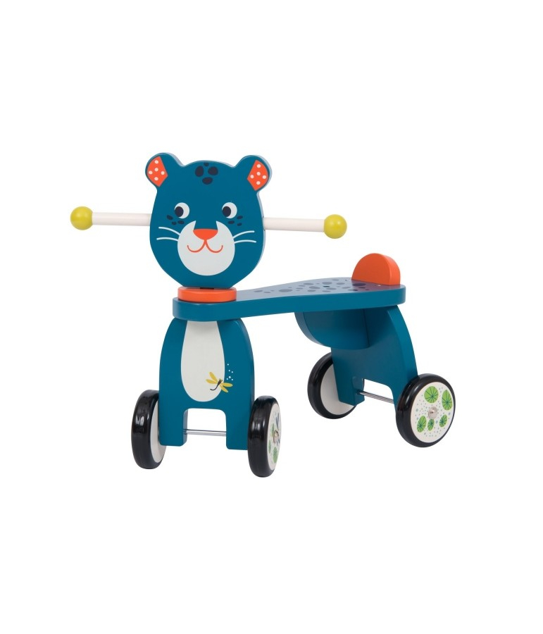 Le porteur panthère 'Dans la jungle' de Moulin Roty est un jouet en bois massif conçu pour les enfants dès 12 mois. À l'effigie de Zimba la panthère, il aide au développement de l'équilibre et de la motricité, tout en offrant une conduite fluide grâce à ses roues en caoutchouc.