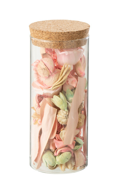 Fleur séchée + bois de pin rose fuchsia dans pot en verre rose