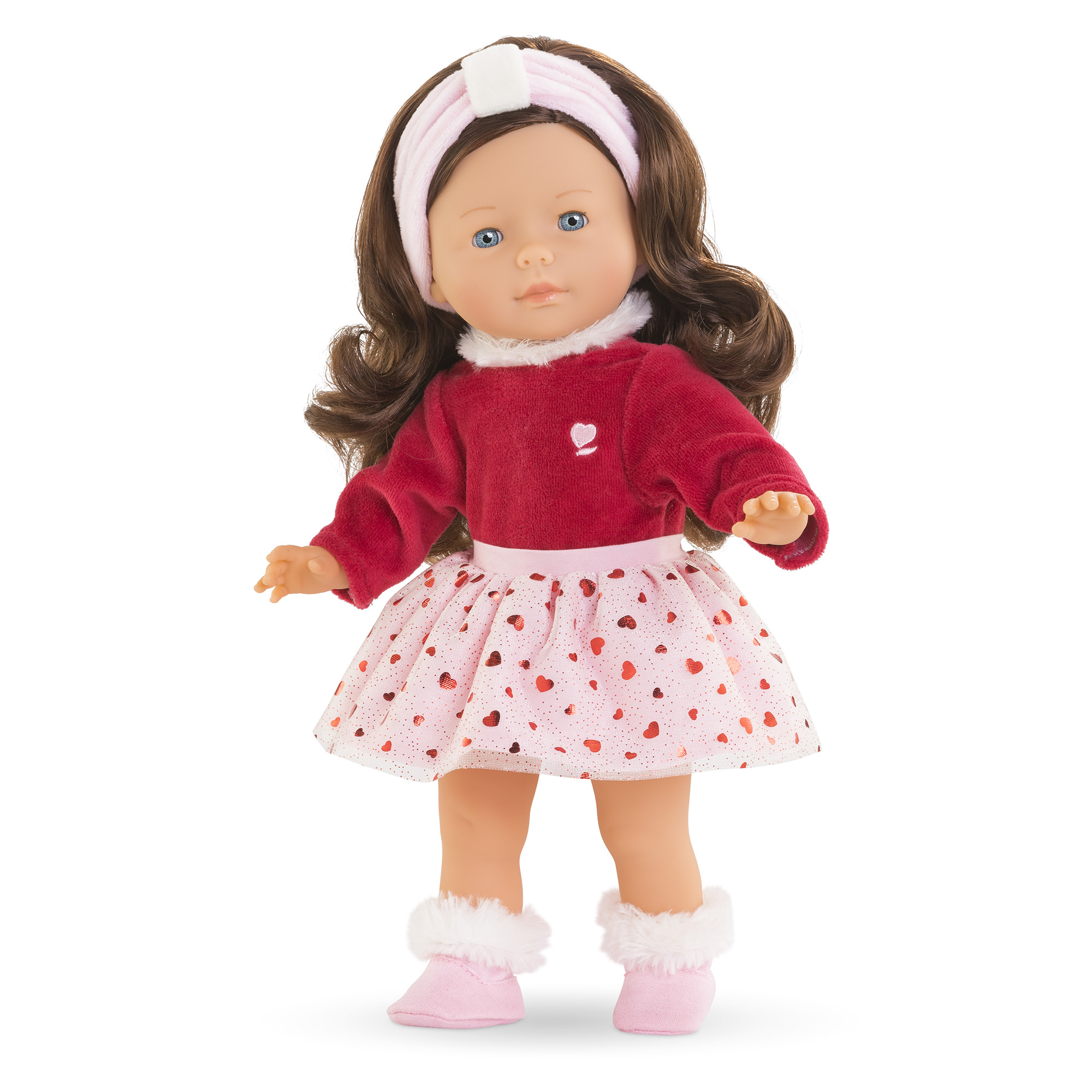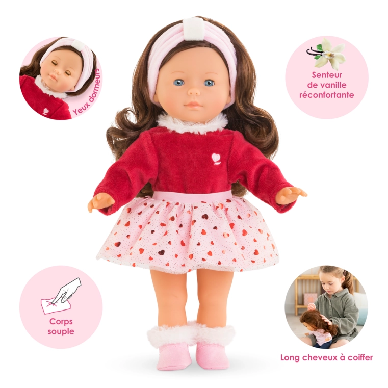 Perle Pétales de Cœurs est une poupée ma Corolle de 36 cm en édition limitée, habillée d'une robe festive rouge et rose avec des cœurs scintillants. Elle possède un corps souple, des cheveux châtains ondulés et des yeux dormeurs. Parfumée à la vanille, elle est idéale pour les enfants dès 4 ans.