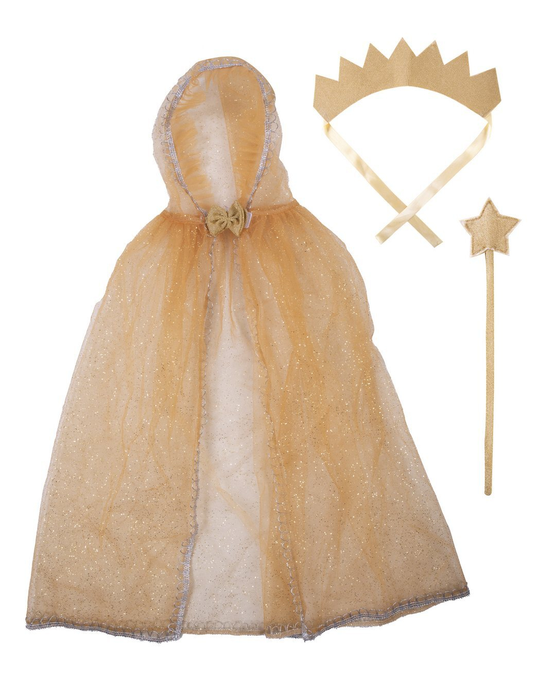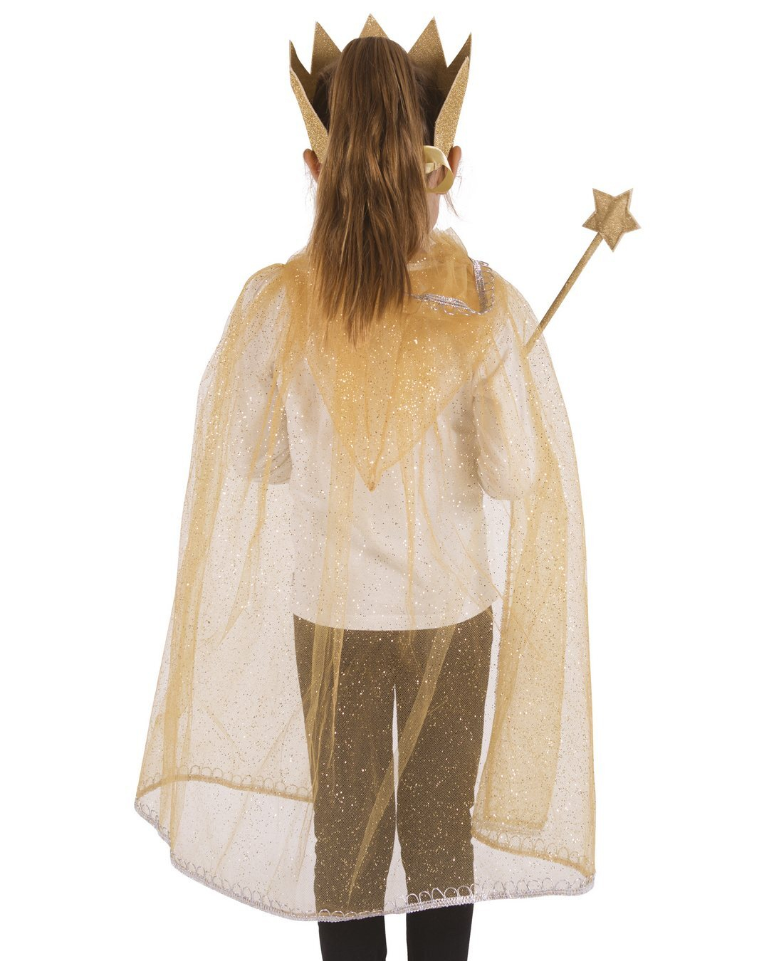 Transformez votre enfant en une véritable princesse avec le kit de déguisement or de P'tit Clown, comprenant une cape scintillante, une couronne et une baguette magique.