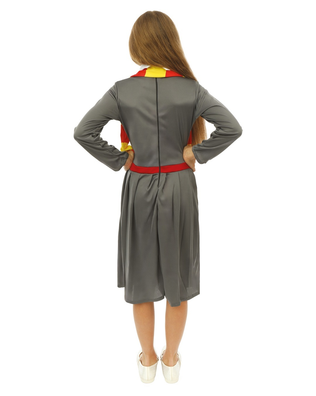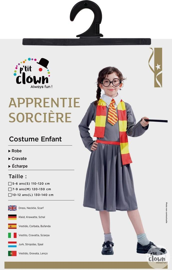 Offrez à votre enfant le costume d'apprentie sorcière de Ptit Clown, comprenant une robe grise, une cravate et une écharpe rouge et jaune, parfait pour les fêtes déguisées.