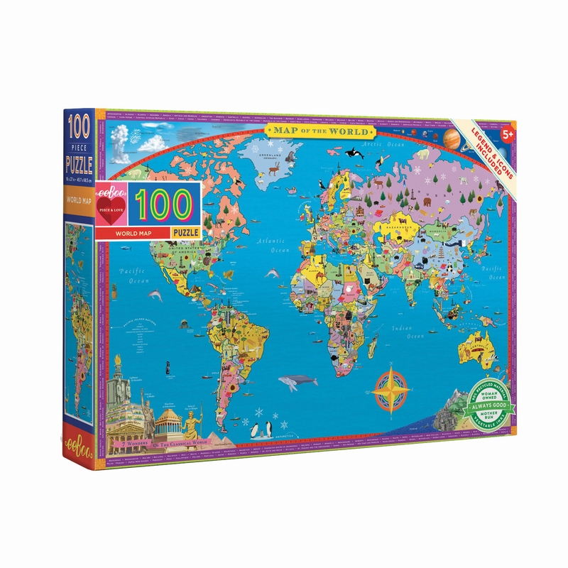 Découvrez le Puzzle Carte du Monde 100 pièces de Wilson Jeux : un jeu éducatif et écologique pour les enfants dès 5 ans, illustrant continents, océans et faune mondiale.