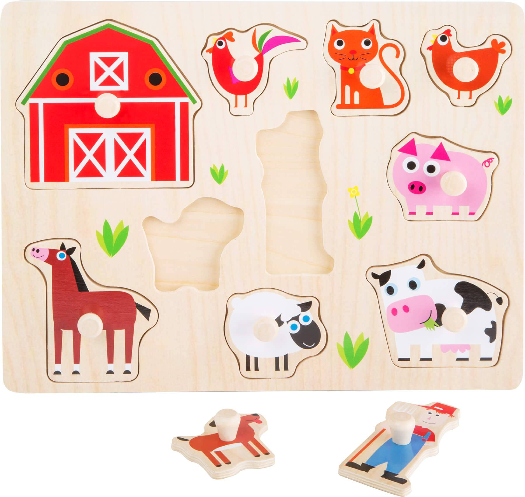 Le Puzzle en bois Ferme de Small Foot est un jouet éducatif composé de neuf pièces colorées avec poignées en bois, représentant des éléments de la vie à la campagne. Idéal pour les enfants dès 12 mois, il stimule la motricité fine et la coordination œil-main.