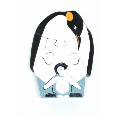 Puzzle en bois de 4 pièces représentant une famille de manchots empereurs, idéal pour les enfants dès 12 mois. Fabriqué de manière éthique par des artisans rémunérés équitablement.