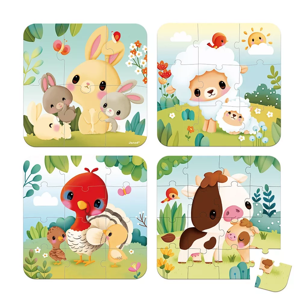 Rendez visite aux animaux de la ferme ! Avec ce lot de 4 puzzles évolutifs, votre enfant dès 2 ans enrichit son vocabulaire et développe logique et motricité, le tout bercé de tendres illustrations. La particularité de ces 4 puzzles en carton, c’est leur nombre de pièces : ils sont évolutifs, allant de 6 à 16 pièces !