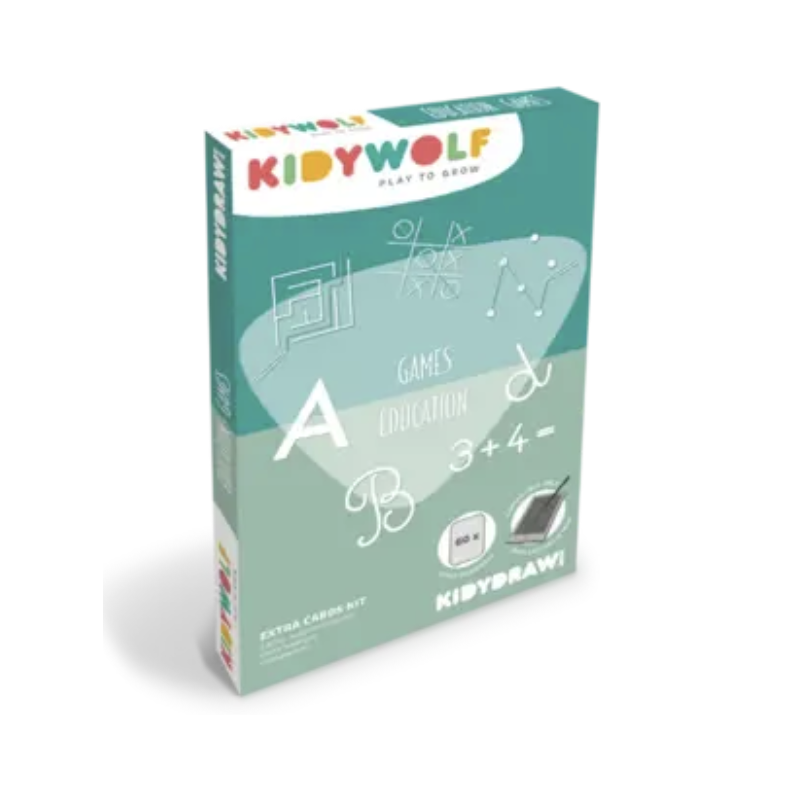 La recharge Kidydraw Mini-jeux et éducation de Kidywolf propose 60 cartes thématiques à décalquer, axées sur les lettres, les chiffres et de petites opérations mathématiques, pour enrichir l'expérience de dessin et d'apprentissage de votre enfant.