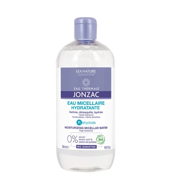 L'eau micellaire hydratante Rehydrate de Jonzac nettoie et démaquille en douceur le visage et les yeux, tout en respectant l'équilibre de la peau. Convient à tous les types de peaux, même sensibles.