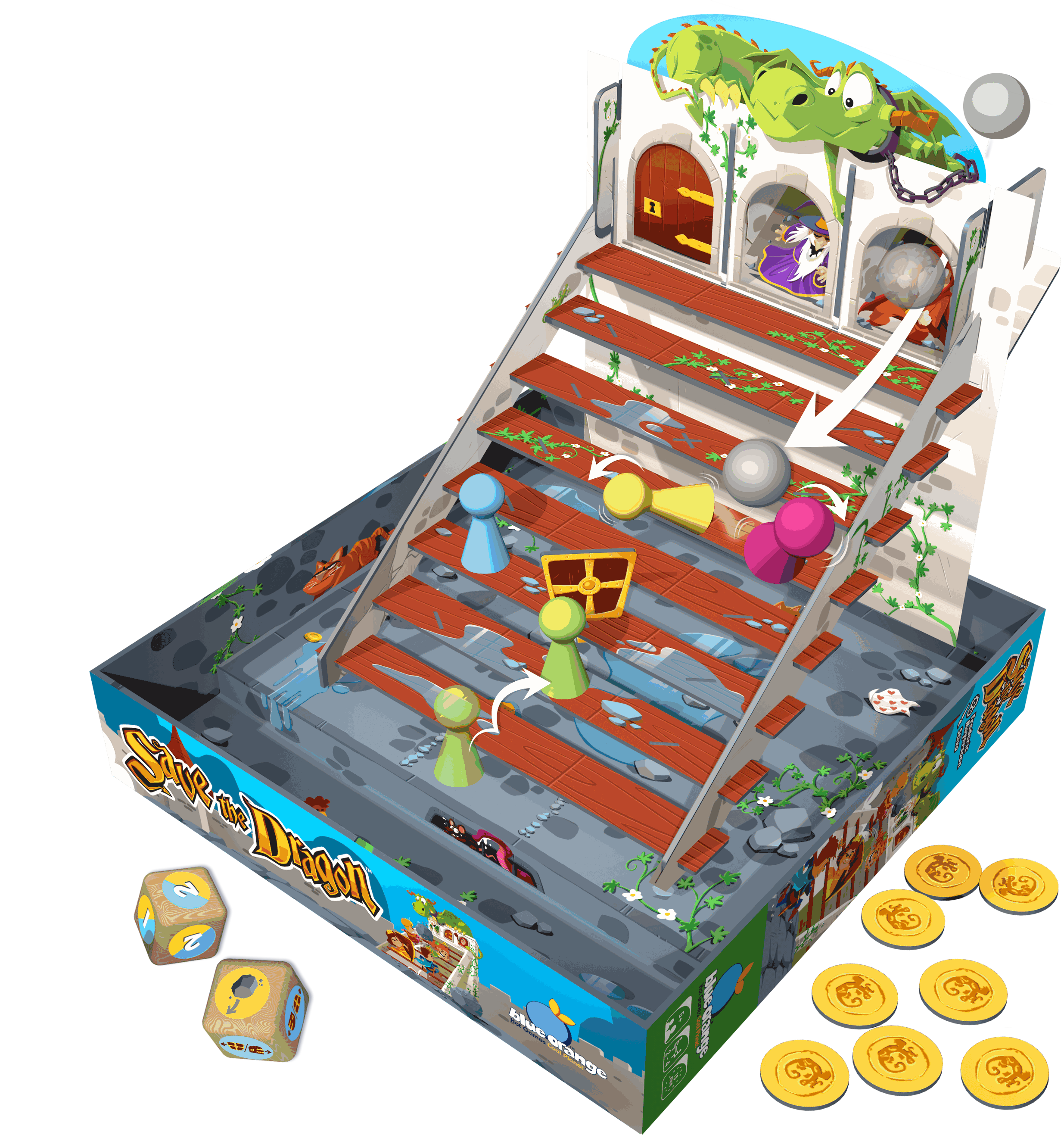 Save the Dragon est un jeu de société captivant pour 2 à 4 joueurs dès 5 ans. Incarnez un prince ou une princesse, gravissez l'escalier du donjon et libérez le dragon enchaîné, tout en évitant les pièges d'un mage diabolique. Une aventure palpitante de 15 minutes vous attend !