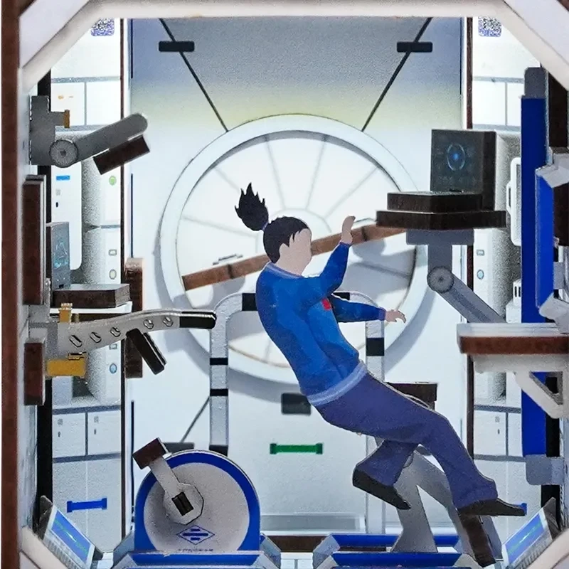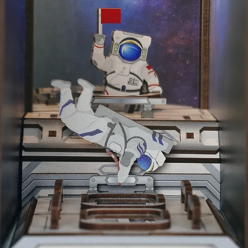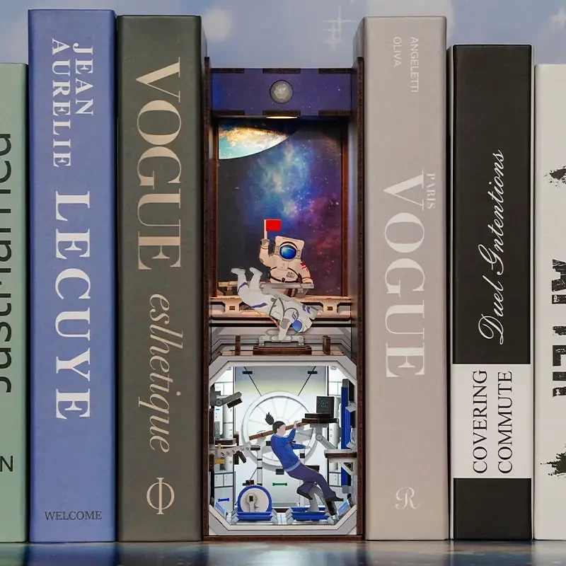 L’objectif est d’assembler toutes les pièces pour créer une scène immersive d’une station spatiale. Une fois terminé, le Station Spatiale Book Nook s'intègre parfaitement dans une bibliothèque, donnant l'illusion d'un passage vers un univers de science-fiction.