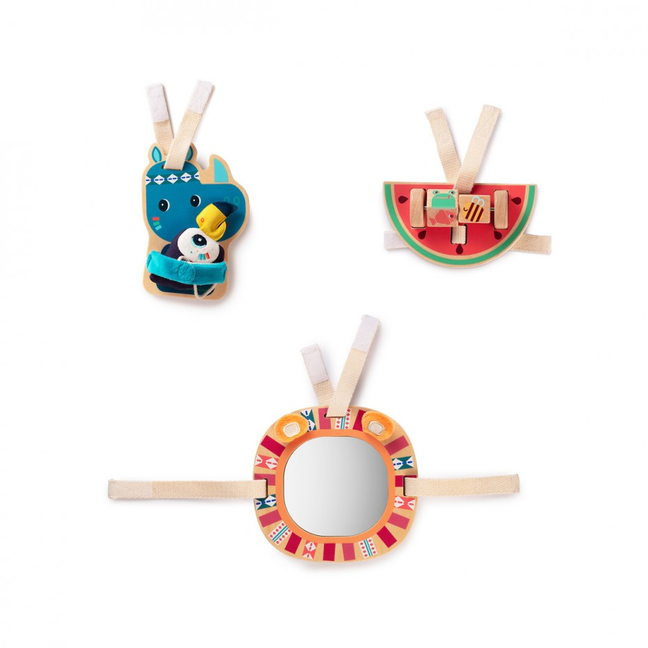Le Set d'activités nomade Marius de Lilliputiens est un jouet d'éveil en bois et tissu pour les bébés dès 9 mois, offrant diverses activités sensorielles.
