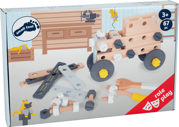 Le jeu de construction comporte une large gamme d'accessoires comprenant des bandes perforées, des cubes filetés, des vis et des disques en bois, ainsi que des tournevis et des clés
