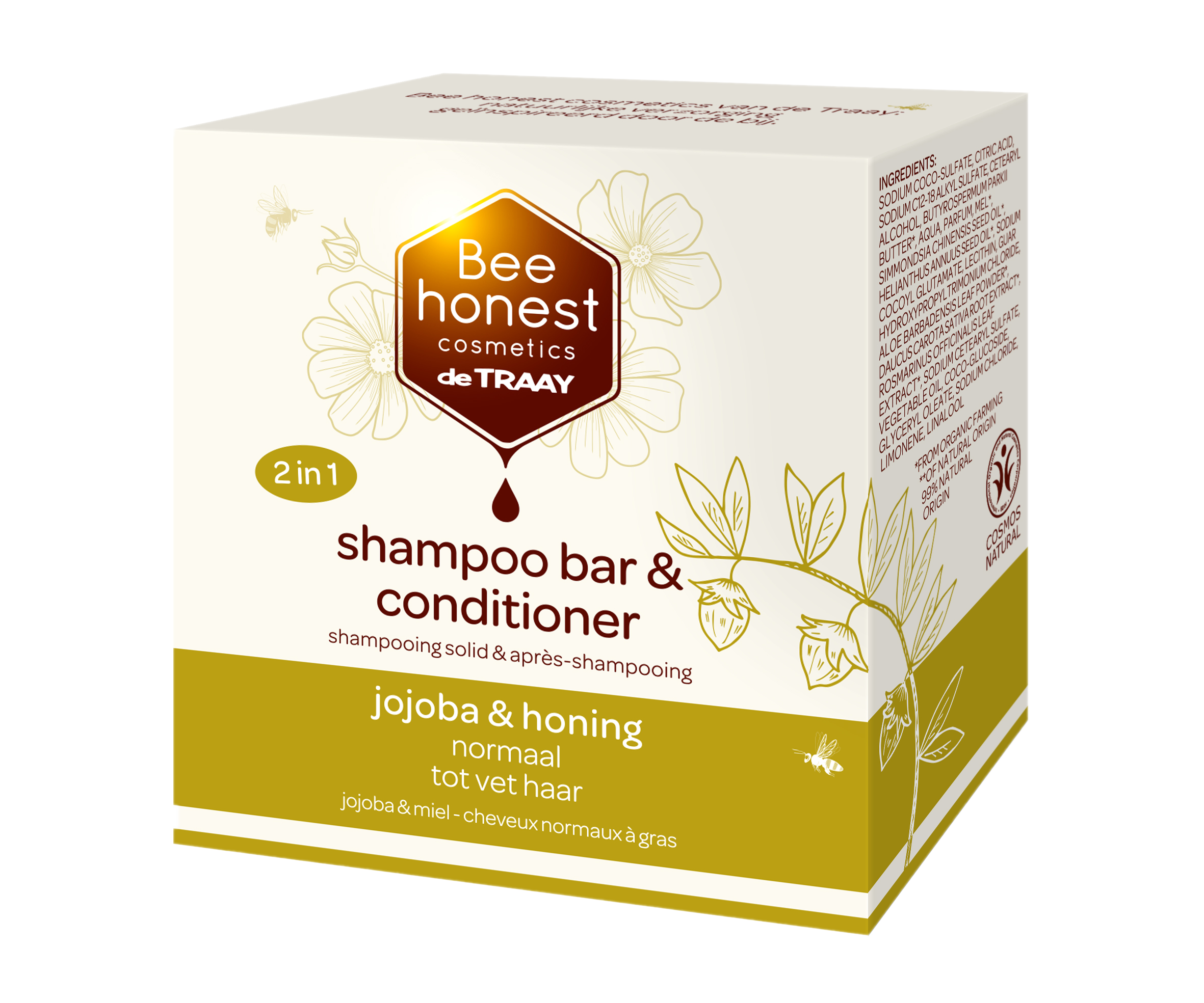 Au nectar que les abeilles tirent des fleurs et des fleurs, elles ajoutent différentes enzymes et bonnes bactéries de leurs glandes salivaires. Pour cette raison, et grâce à l'épaississement par évaporation naturelle, le nectar est finalement converti en miel. Le miel est un « humectant », un ingrédient qui attire et retient l'humidité de la peau et des cheveux. Le jojoba ralentit la libération de sébum et c'est un bon hydratant pour le cuir chevelu. La barre dégage une douce odeur de miel, a un effet apaisant et rend les cheveux et la peau doux et souples.