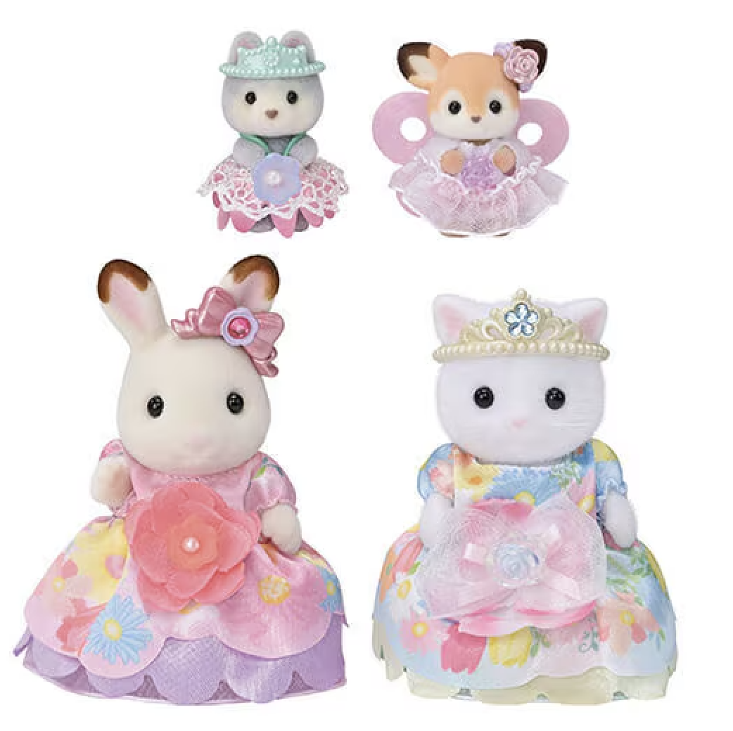 Ajoutez une touche royale à votre collection avec le set Les princesses en robes à fleurs de Sylvanian Families, comprenant quatre figurines articulées en tenues exclusives et leurs accessoires de princesse.