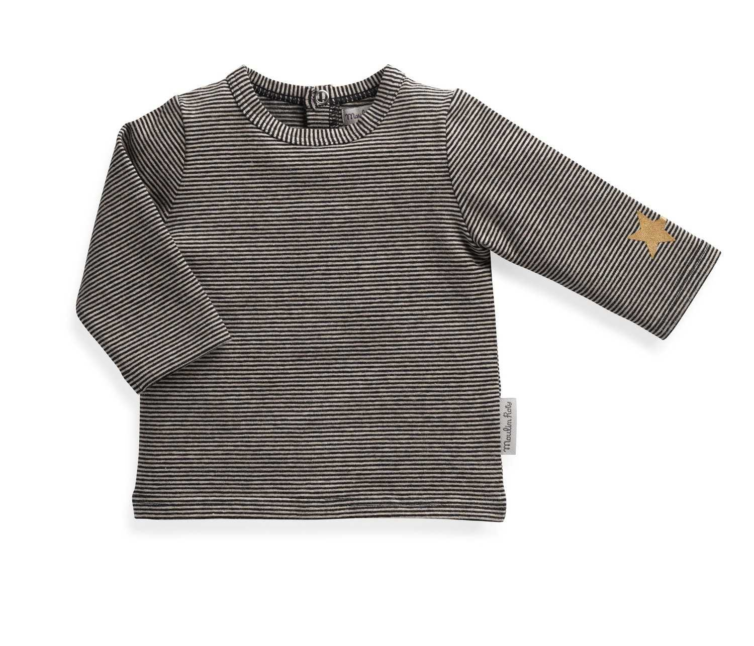 Tee - shirt manches longues, col rond, coupe droite, en jersey rayé beige et noir avec étoile sérigraphiée or. Fermeture pressions dos pour un habillage facile.