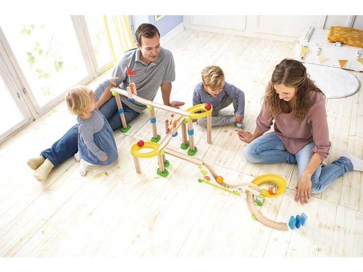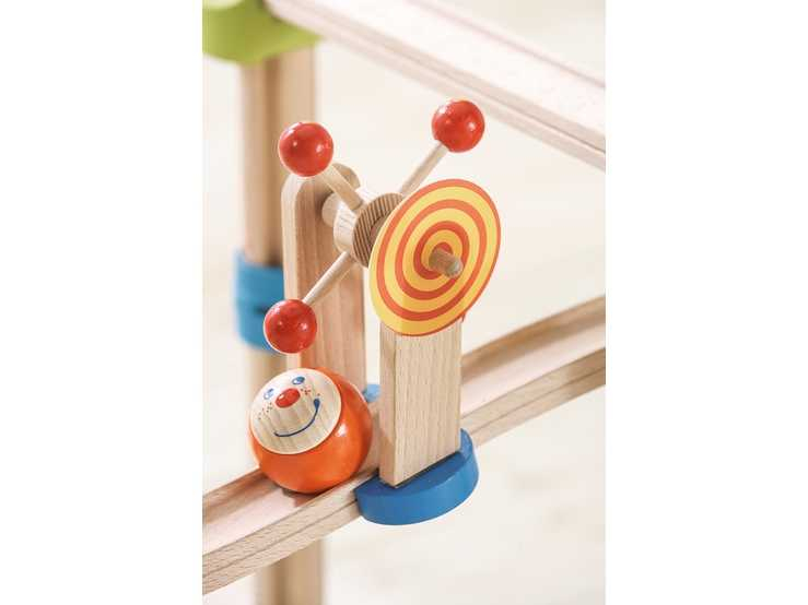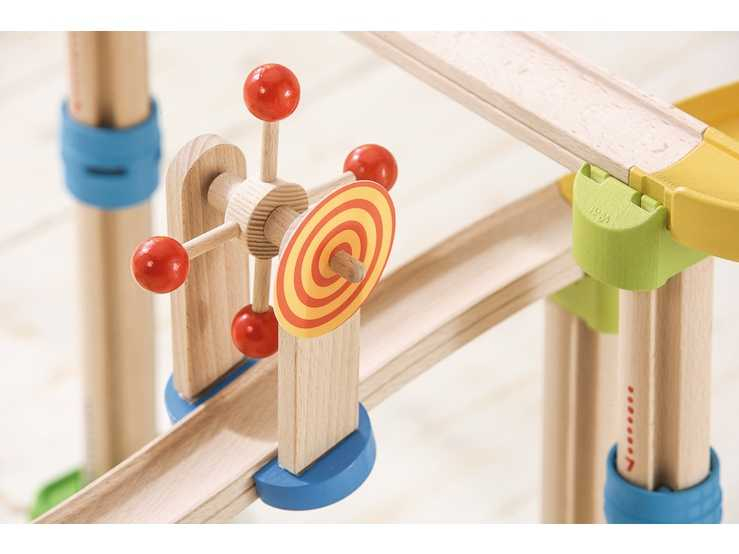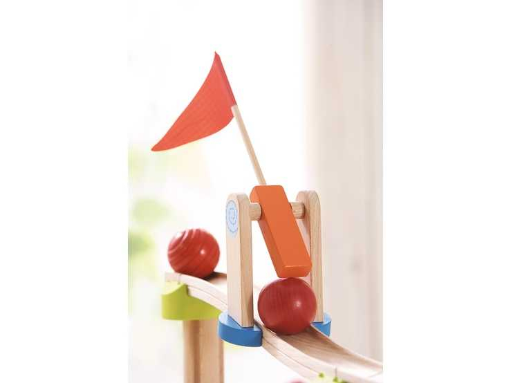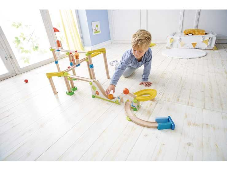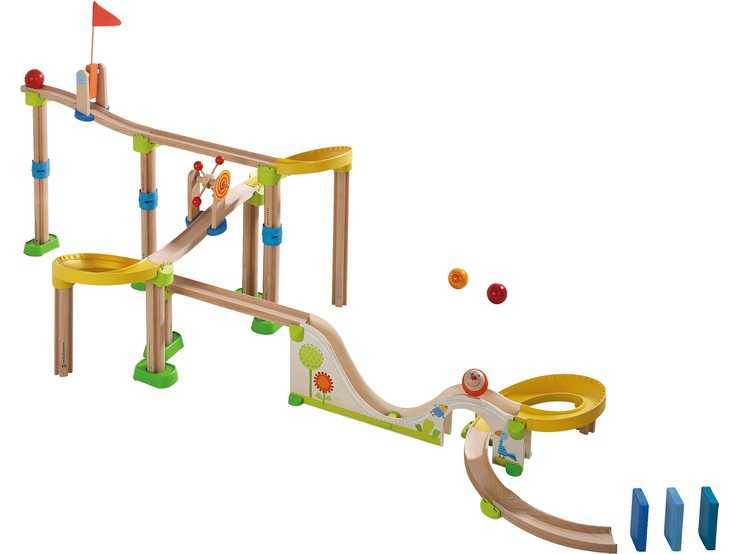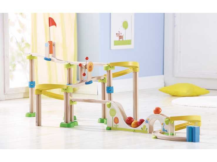 Le Toboggan Tobogogo - Rayllie géant de Haba est un jeu de construction en bois massif comprenant 42 pièces et 6 billes, idéal pour développer la motricité fine et l'orientation spatiale des enfants dès 3 ans.