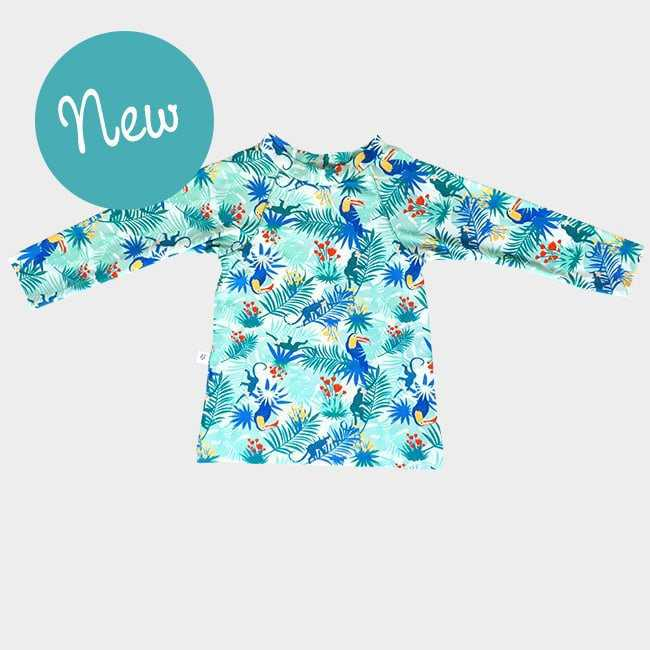 T-shirt anti-UV à manches longues pour les enfants de 3 mois à 3 ans qui protège la peau de bébé des effets nocifs des UV du soleil, dans l'eau et hors de l'eau.