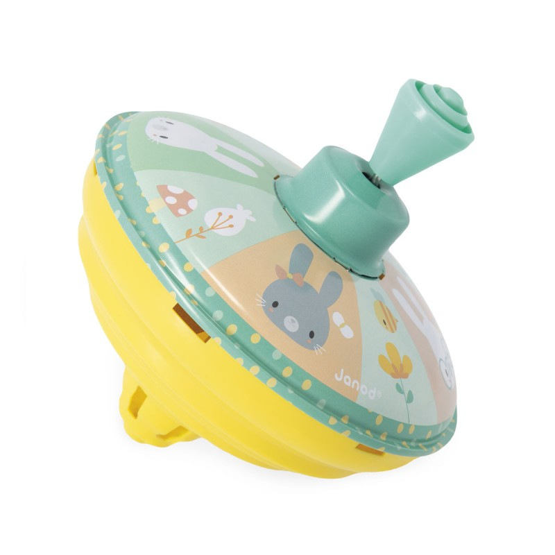 La Toupie métal Lapins de Janod est un jouet d'éveil en métal avec poignée en plastique, décorée de petits lapins, idéale pour développer la motricité fine des enfants dès 18 mois.