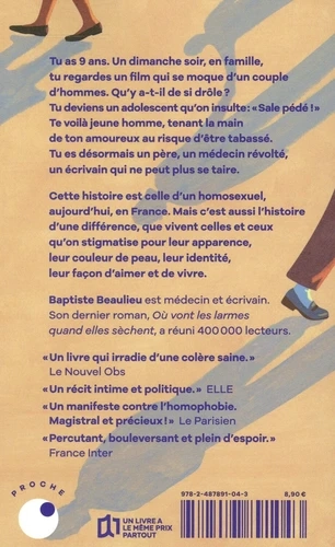 À travers ce récit autobiographique, Baptiste Beaulieu nous plonge dans son parcours de vie en tant qu'homme homosexuel en France. De l'enfance marquée par des moqueries à l'adolescence confrontée aux insultes, jusqu'à l'âge adulte où il devient médecin, père et écrivain engagé, l'auteur partage avec sincérité les défis et les discriminations rencontrés. Ce livre est un témoignage puissant sur l'homophobie persistante et une réflexion profonde sur l'acceptation de soi et des autres.